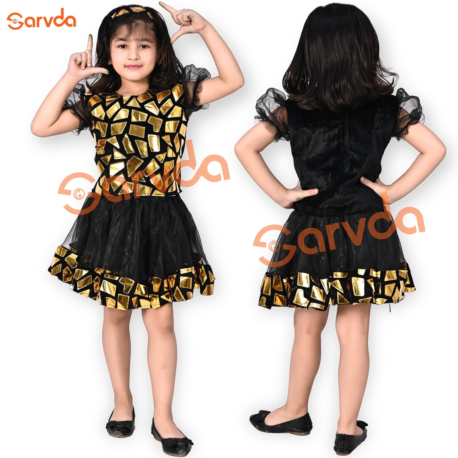 Make your little princess shine on stage with this gorgeous Golden Mirror Mosaic Fancy Dress by Sarvda. Perfect for school functions, dance performances, or fancy dress shows — this sleeveless halter-neck frock features a stunning golden mosaic pattern on the bodice and matching detailing along the hemline. The flared black skirt adds volume and elegance, while the soft velvet blend fabric ensures comfort for long hours of wear.