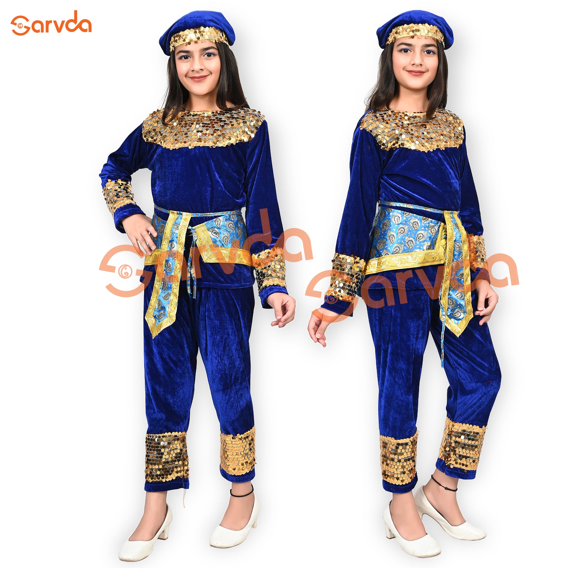 Description :Step into elegance with this beautifully crafted peacock-inspired traditional dance costume. Designed in rich royal blue velvet, the outfit is adorned with intricate golden sequin embroidery across the chest, reflecting the majestic hues of a peacock's plumage. The full-sleeved top features bold yellow and black striped cuffs, adding a striking contrast to the deep blue base. A coordinating patterned belt detail cinches the waist for added flair.